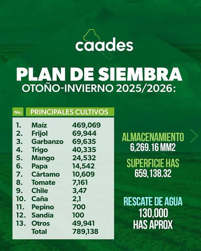 Bello Esquivel explicó que la definición del programa de cultivos se basó en los volúmenes de agua disponibles establecidos por la Comisión Nacional del Agua (Conagua), que actualmente reporta un almacenamiento de 6 mil 269 millones de metros cúbicos y una disponibilidad de riego para 659 mil hectáreas.