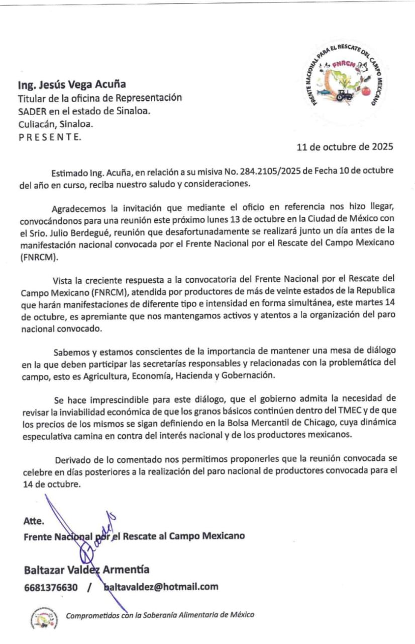 Asociaciones de agricultores de 20 estados de la república mexicana han convocado a una manifestación pacífica como parte de un movimiento nacional denominado “Frente Nacional para el rescate del Campo Mexicano”, para exigir mejores condiciones para el campo mexicano.