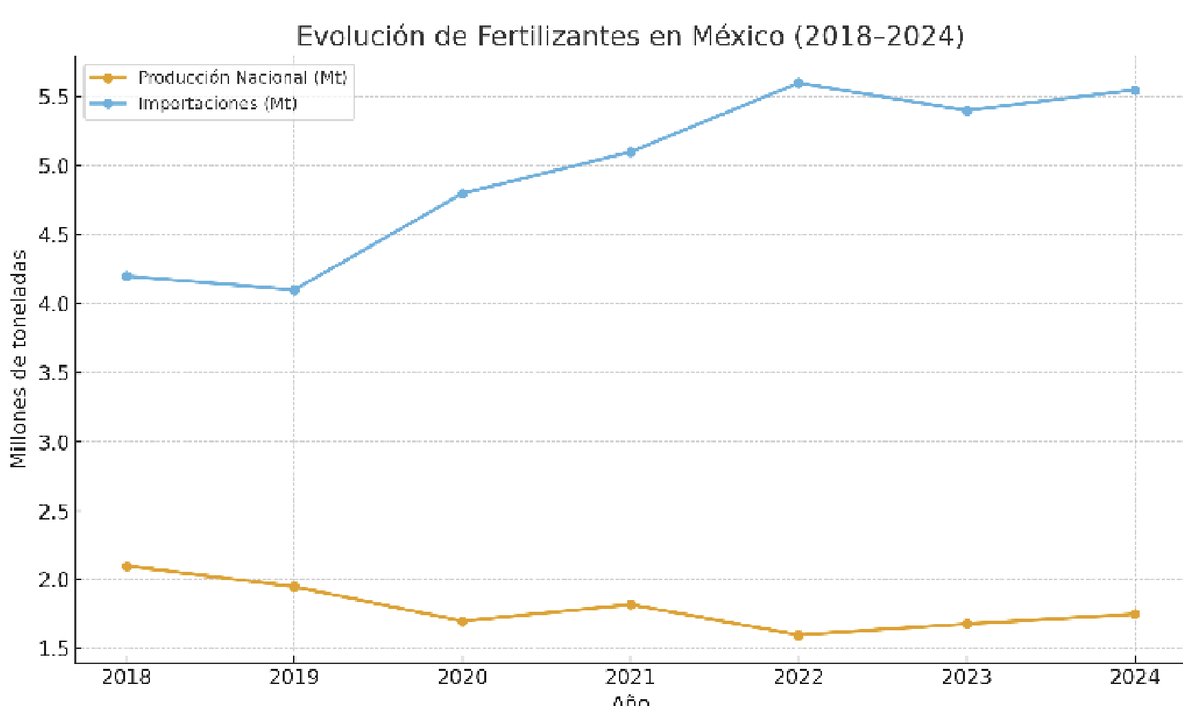Durante 2024, la producción nacional de agroquímicos y fertilizantes en México registró un crecimiento del 26.13 % con respecto al año anterior. Con ese aumento, la producción interna alcanzó aproximadamente 1.614 millones de toneladas.