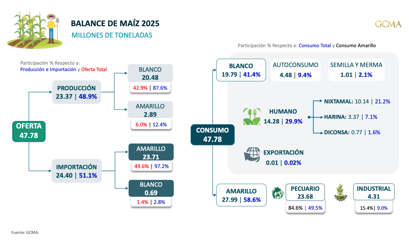 La oferta total de maíz en 2025 asciende a 47.78 millones de toneladas, integrada por: